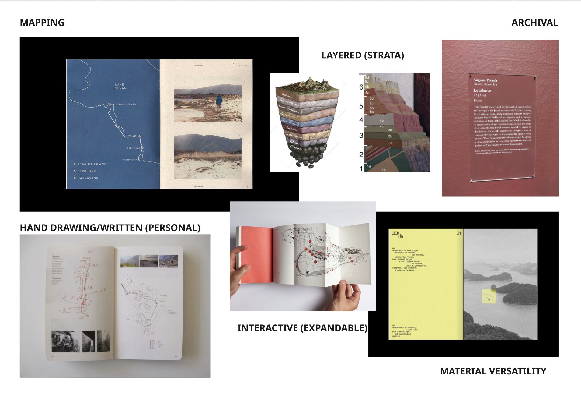 I envision my pictorial resembling a museum catalogue that represents the relationship between objects, earth material and human memory. The pictorial would treat the material objects as condensed archives of time and narratives. The content would be centered around the visual typology of the selected objects, with classification labels and associated narratives to build the archive. I want to use the catalogue style to define the structure while creating a simple but legible pictorial. Objects will be visually divided into different sections of physical appearance, origins, associated human memories, and abstracted visual study. The reason I want to use this structuring style and organization is to allow the material’s complexity to shape the visual realm and create a flexible archive of contents.